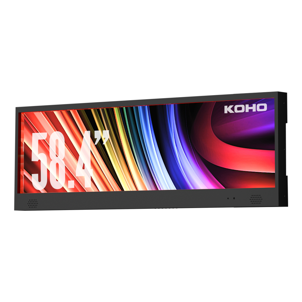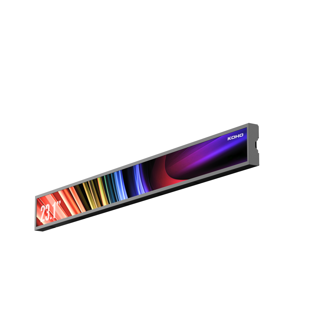 KOHO bar screens feature ultra-wide aspect ratios, allowing businesses to display information, promotions, or schedules in tight spaces such as shelves, end caps, aisles, and public transit areas where conventional screens are impractical.